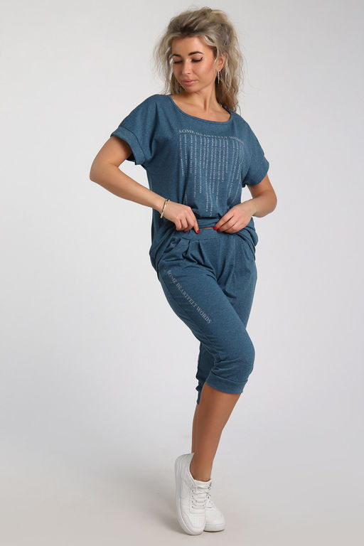 Костюм из меланжированной кулирки футболка+бриджи. Силуэт свободный. Футболка оверсайз, спущенное плечо, изысканный серебристый принт. Бриджи с карманами, низ на манжетах, по поясу две складочки с каждой стороны.
