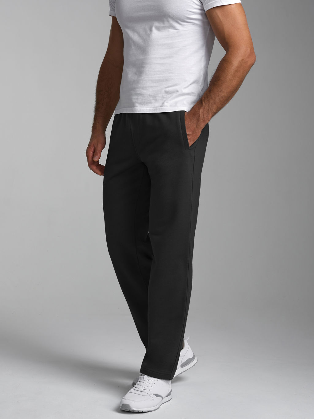 Брюки мужские из плотного хлопкового трикотажного полотна с петельной изнанкой. Брюки прямого силуэта с прорезными карманами, Эластичный пояс дополнительно регулируется шнуром.