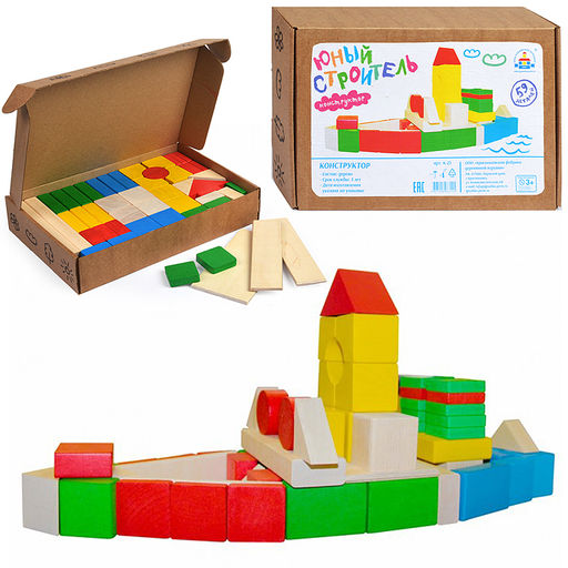 В наборе 59 деталей, благодаря которым можно построить все, что пожелает фантазия ребенка: дома, башни, машины, самолеты, пароходы,крепости и мосты (множество вариантов сборки)