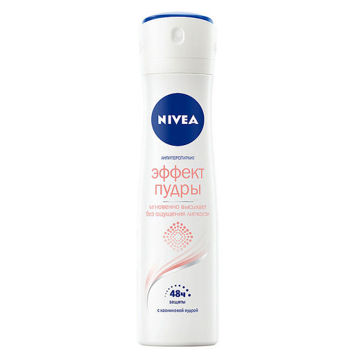 Дезодорант-антиперспирант спрей NIVEA Эффект Пудры сочетает в себе надежную защиту антиперспирирующей формулы и невероятную мягкость уникального природного компонента - каолиновой пудры. Каолин, также известный как Белая глина, обладает отличными абсорбирующими и обволакивающими свойствами, поэтому сразу после нанесения дезодорант мгновенно высыхает, не оставляя липких ощущений на коже, и придает ей невероятную мягкость. Антиперспирант защищает от неприятного запаха на 48 часов. Без ощущения липкости на коже и без белых следов на одежде. Уже более 100 лет Nivea создает особенно бережные для кожи формулы. Испытай невероятную мягкость и эффективную защиту от пота и неприятного запаха! Обладает нежным ароматом сливочных и ярких пудровых ноток.