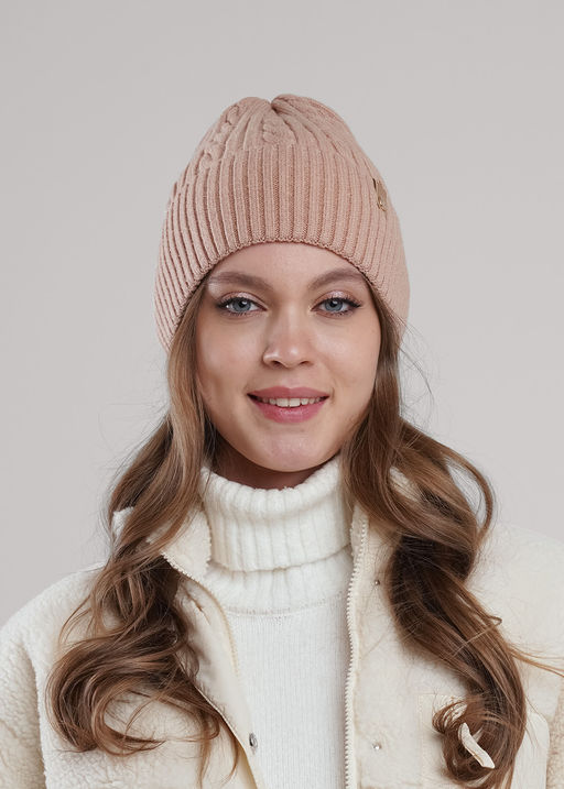 Шапка женская однослойная с отворотом, без подклада. Декорирована нашивкой логотип. Отдично подойдёт для осенне- весеннего периода. 50%Вис28%ПЭ 22%ПА(нейлон)