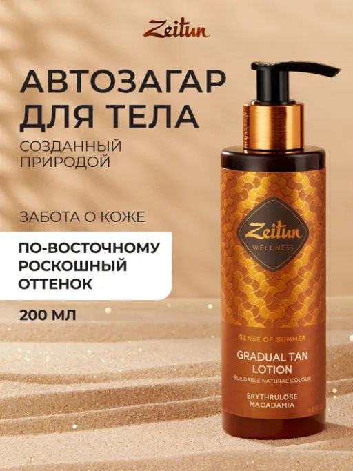 Не хочется расставаться с роскошным пляжным загаром? Лосьон-автозагар от Зейтун будет дарить Вашей коже любимый бронзовый оттенок круглый год. Натуральная формула с Эритрулозой, маслами Ши, Макадамии и Зародышей пшеницы постепенно дарит коже естественный оттенок загара без пятен, разводов и полос, а сочный фруктовый аромат с нотами Груши, жасмина, Ванили и Сандала дарит подлинное удовольствие от использования лосьона. Благодаря комплексу ценных масел средство обеспечивает коже полноценное увлажнение, питание и защиту от внешних воздействий. Средство мгновенно впитывается и не оставляет следов на одежде.