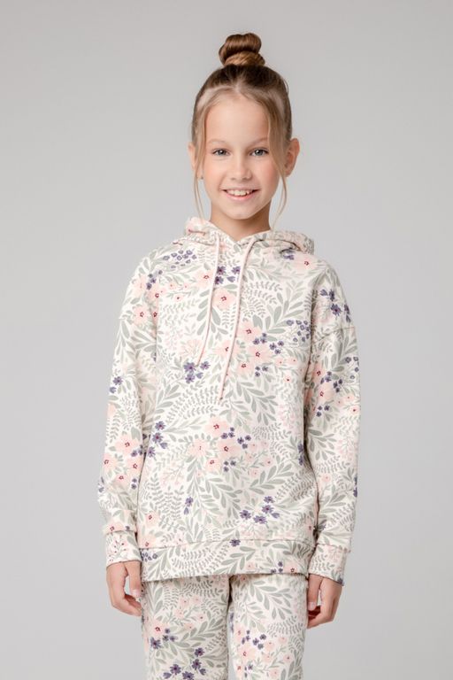 Толстовка с капюшоном для девочки из петельчатого футера . Оригинальная набивка выполнена из стойких текстильных красителей. Манжеты и пояс из эластичного трикотажа.­