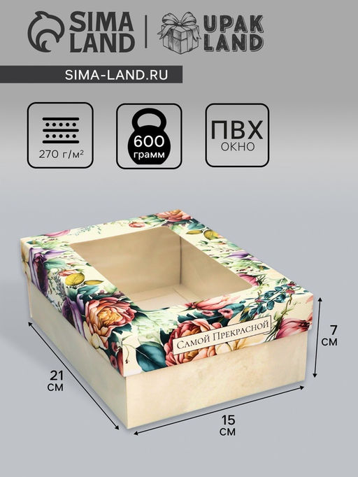 Праздничная складная коробка с крышкой-дном – идеальный вариант для оформления подарка.Она сочетает в себе стильный дизайн и удобство использования.Благодаря оригинальной конструкции, коробка легко собирается и разбирается, что делает ее особенно удобной для транспортировки и хранения.Внутри достаточно места для размещения различных подарков, будь то украшения, сладости или другие приятные мелочи.Яркий праздничный декор добавит радости любому торжеству, а качество исполнения позволит использовать коробку многократно.Сделайте свой подарок незабываемым с этой замечательной упаковкой! Вид упаковки: Для печенья. Вид упаковки: Универсальная. Вид упаковки: Для макарун. Форма: Прямоугольная. Плотность, г/м²: 270. Длина, см: 21. Ширина, см: 15. Высота, см: 7. Тематика: Цветочно-растительная. Тематика: Женская. Тематика: Надписи, цифры, буквы. Рисунок: Да. Тематика праздника: День рождения. Тематика праздника: 8 Марта. Тематика праздника: 14 Февраля. Вид: Кондитерские коробки. Вид еды: Для десертов. Вид еды: Универсальный. Вид еды: Для печенья. Вид: Складные коробки. Вид: Крафт коробки. Вид: Прямоугольные. Размер: Средний (18-24 см). Окошко: Да. Крышка-дно: Да. Бесплатная доставка: Да. Наша разработка: Да. Размеры товара: 15/7/21.
