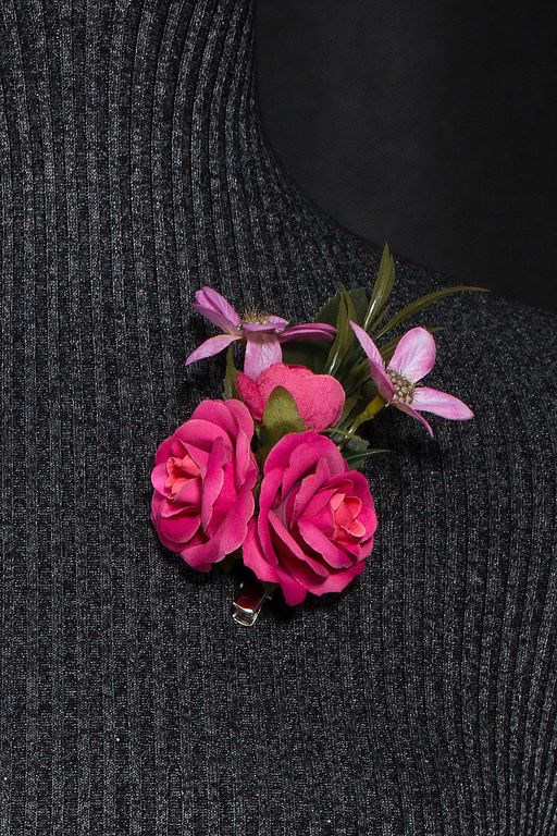 Цветочные композиции прочно поселились в летнем женственном гардеробе. Привлекающий внимание аксессуар - букетик роз яркого розового цвета.