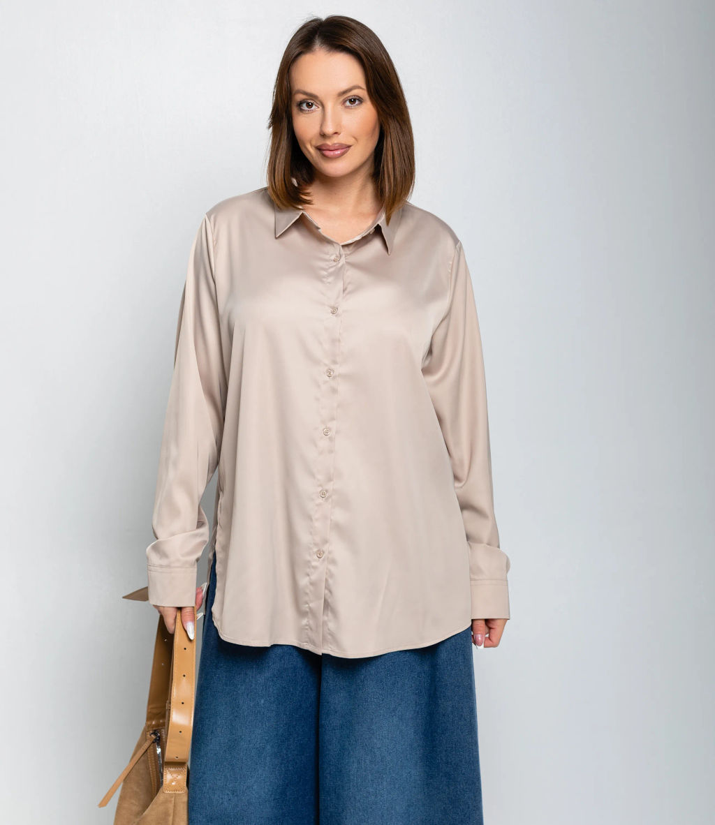 Рубашка это часть гардероба, которая подчёркивает привлекательность и индивидуальность любой женщины. Рубашка прямого свободного кроя, слегка удлинённая, с классическим отложным воротником и центральной планкой на пуговицах; втачные длинные рукава с прямоугольными манжетами на пуговицу, округлённый нижний край с удлинением по спинке и боковыми разрезами для удобства движения, отсутствие нагрудных карманов подчёркивает минималистичную линию; лёгкий гладкий материал средней плотности с мягкой драпировкой и небольшим блеском, аккуратно обработанные швы и скрытая строчка на планке, прочные закрепки в зонах нагрузки, посадка с запасом в области плеч и груди для расслабленного, но аккуратного силуэта, универсальная базовая модель для деловых и повседневных образов. Для пошива использована ткань: 95% полиэстер, 5% спандекс. Мы предлагаем выгодные оптовые условия, гибкую ценовую политику и надёжные поставки для магазинов. Установленная цена адекватна и позволит вам формировать привлекательную наценку и обеспечивать высокую оборотность. Предложите своим покупательницам рубашку, сочетающую комфорт, качество и повседневную элегантность. -- Характеристики -- Цвет: бежевый Пол: Женский Страна производитель: Китай Сезон: Демисезон Материал: Полиэстер, Спандекс