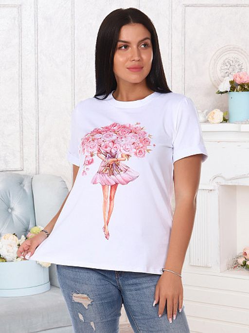 Футболка женская с коротким рукавом с отворотом, горловина круглой формы из отделочного материала, на детали переда печать, в боковых швах разрезы.