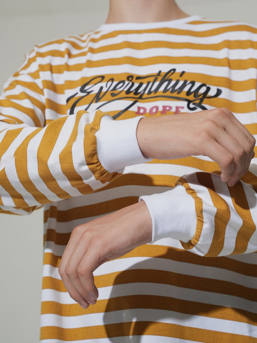 Лонгслив "оверсайз" прямого свободного силуэта, со спущенной линией плеча и длинными втачными рукавами на манжетах из хлопковой рибаны пл. 220 г/м2. Горловина лонгслива округлая, обработана планкой из той же хлопковой рибаны, с изнанки по горловине спинки настрочена фирменная киперная лента.