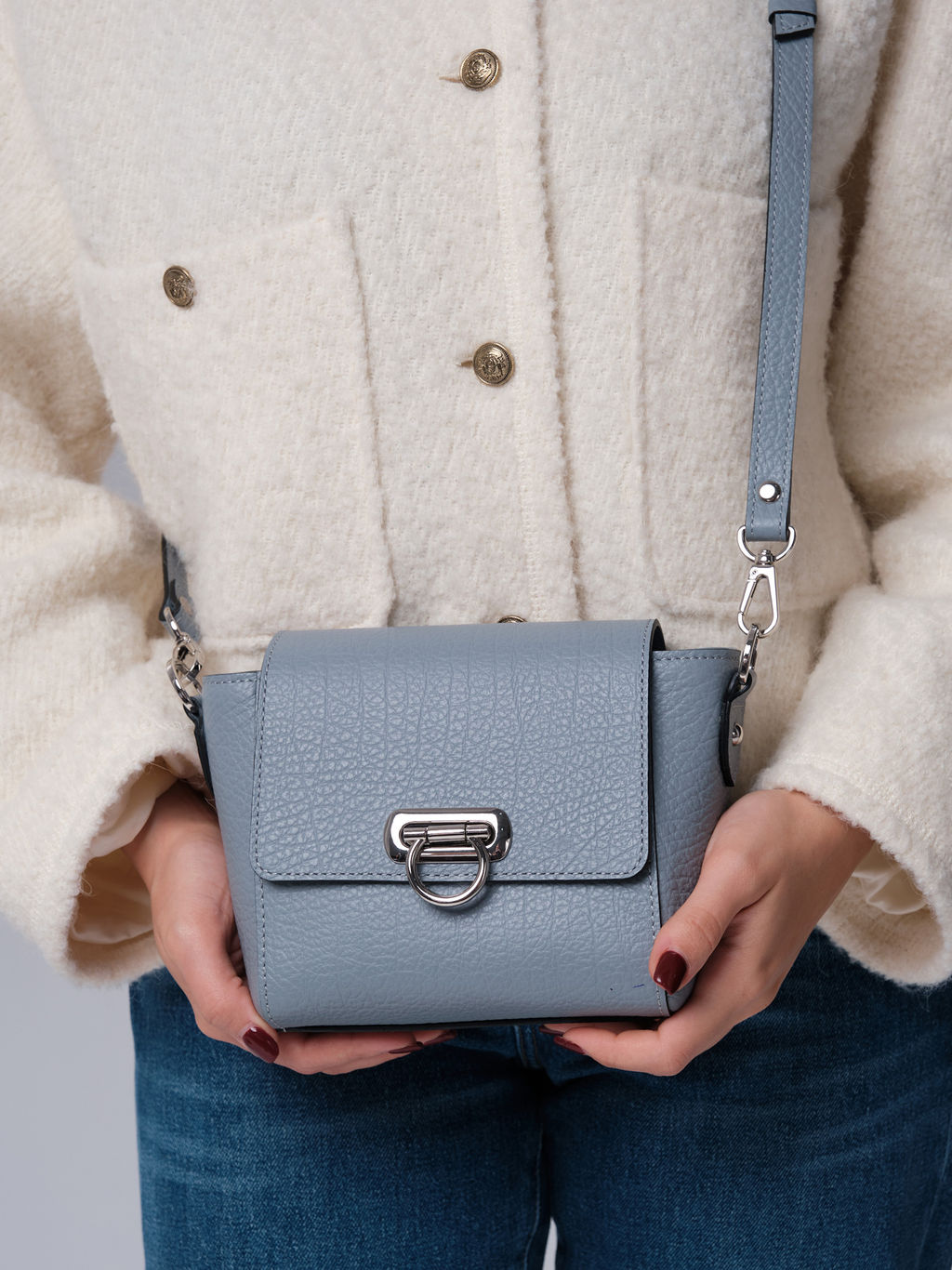Женская кожаная сумка кросс-боди Azaro серо-голубой/бизон - стильный акцент для тех, кто ценит лаконичность и качество. Детали: натуральная кожа, внутренняя отделка клапана из натуральной замши, съемный регулируемый ремень, 1 внутреннее отделение, 2 внутренних кармана - на молнии и открытый, застежка на молнию и замок-вертушку. Выполненная из натуральной кожи, эта сумка кроссбоди обладает выразительной текстурой и безупречным исполнением. Серо-голубой оттенок придаёт образу утончённость и элегантность. Этот цвет хорошо сочетается с разными образами, делая сумку универсальной деталью гардероба. Компактная форма и функциональный дизайн обеспечивают комфорт в повседневном использовании, а металлическая фурнитура в серебристом тоне добавляет современного шика. Сумка станет стильным завершением образа и подчеркнёт безупречный вкус своей обладательницы. -- Характеристики -- Тип товара: Женские сумки Цвет: серо-голубой Материал: Замша натуральная, Натуральная кожа Бренд: Azaro Тип: Сумка через плечо Страна-изготовитель: Россия Высота, см: 14 Ширина, см: 21 Глубина, см: 10 Материал подкладки: Хлопок Количество внутренних отделений: 1 Тип застежки: Молния, Замок-вертушка Формат А4: не вмещает Длина плечевого ремня, см: 114 Ручки: Плечевой ремень, Одна лямка Пол: женская коллекция Группа товара: Сумки Количество внутренних карманов, шт: 2