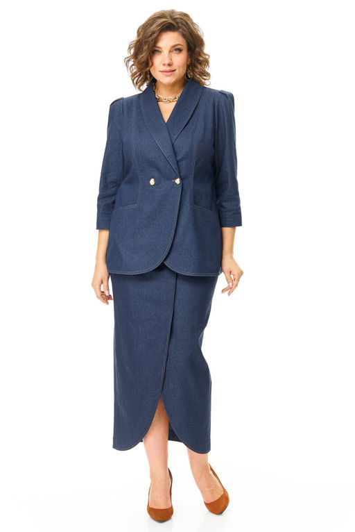 Комплект женский состоит из жакета и юбки. Жакет полуприлегающего покроя с зауженной линией плеча. Застежка двубортная на золотые пуговицы. По спинке и переду обработаны рельефы выходящие из плеча. Низ борта округлой формы. Воротник типа "шаль". По переду обработаны карманы в подрезах. Рукав длиной 3/4  со складками по окату.
