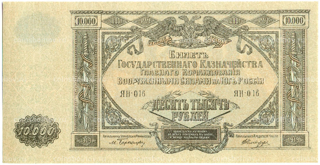• Банкнота 10000 рублей 1919 года Главное командование Вооруженными силами на Юге России