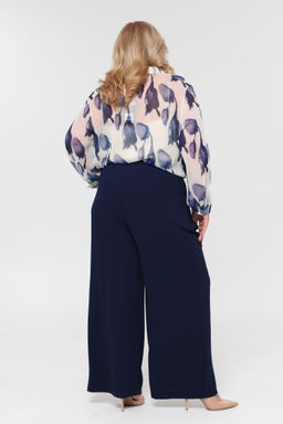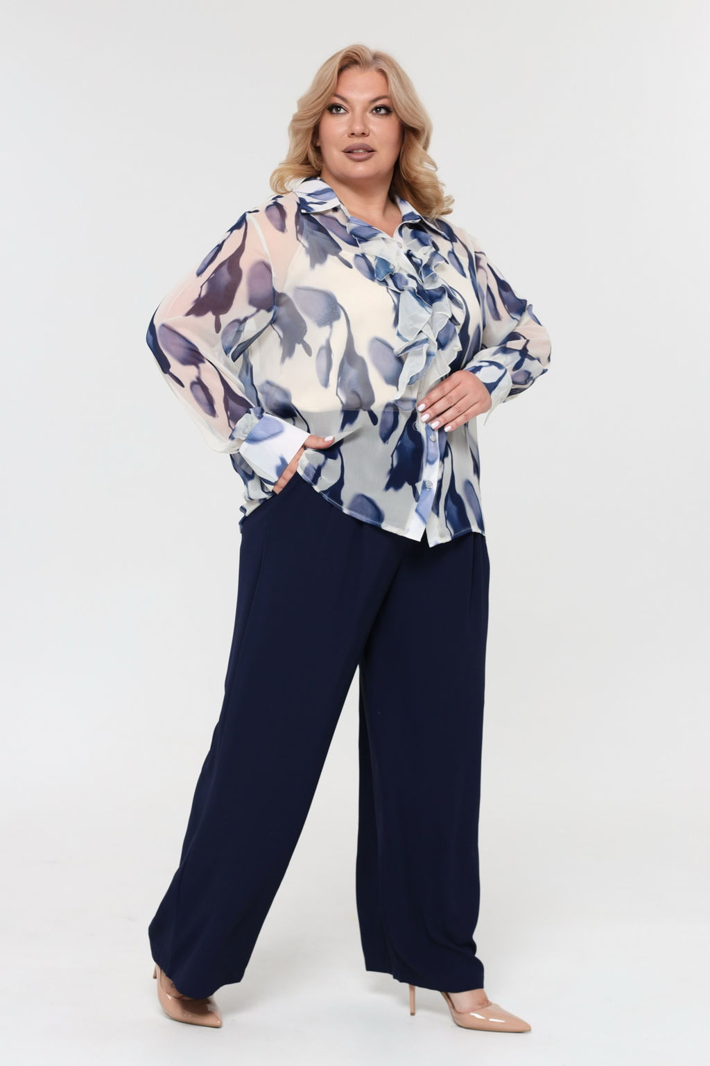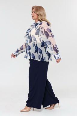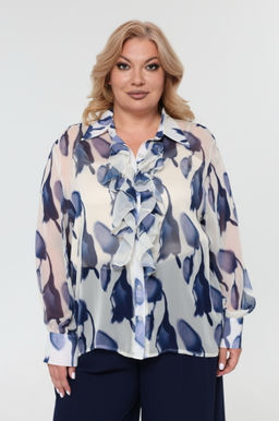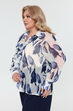 Комплект состоит из рубашки и топа.  Рубашка прямого кроя выполнена из мягкого шифона. Модель привлекает внимание оригинальным дизайном. Рубашка застегивается спереди по всей длине на пуговицы под планку. Имеет классический отложной воротник и рукава полной длины на широких манжетах по низу. Кокетливый волан по планке добавляет модели женственности, а растительный принт - динамичности.