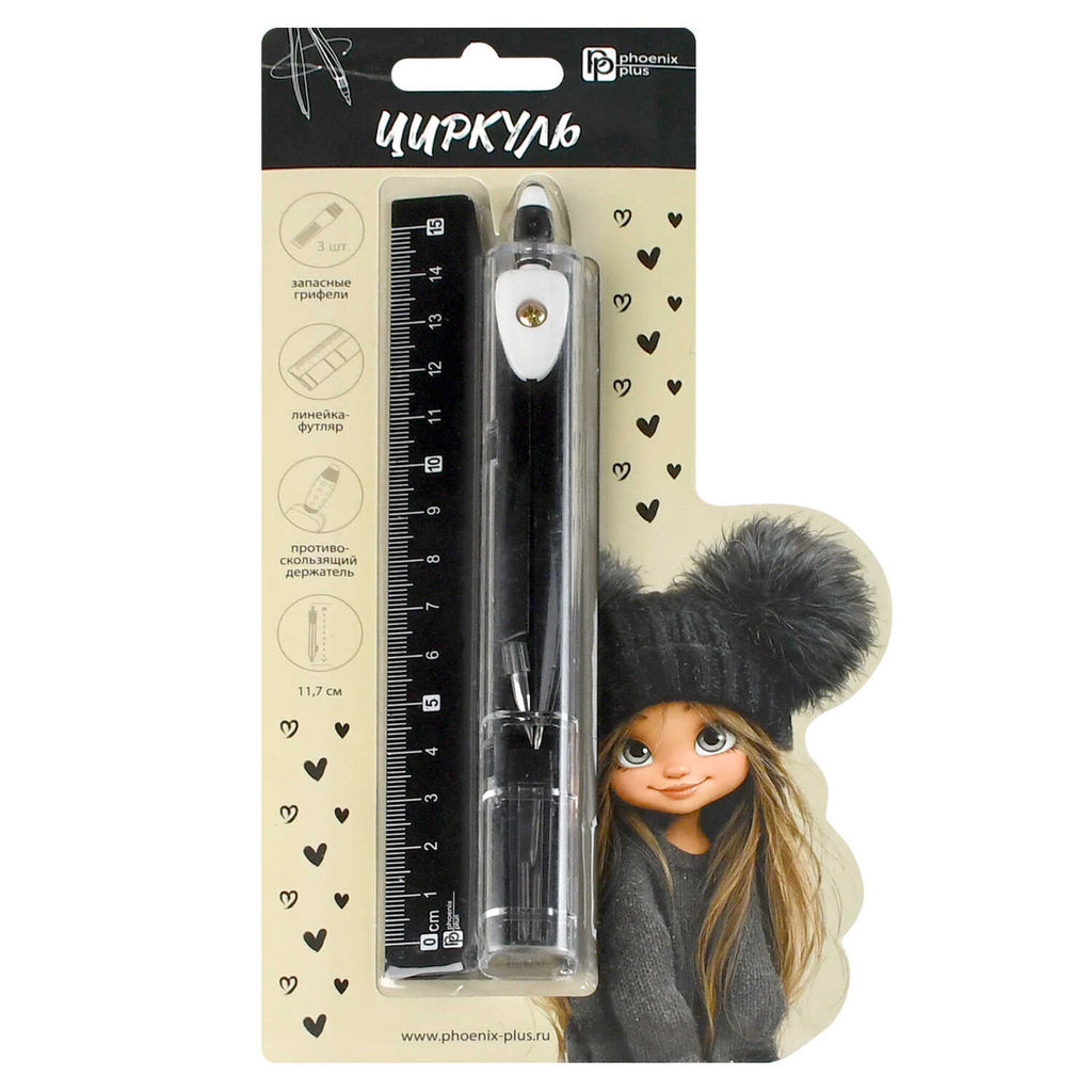 Циркуль в комплекте со сменными грифелями , ДЕВЧОНКА В ШАПКЕ арт.73026/ 24 длина циркуля:11,7 см, 16