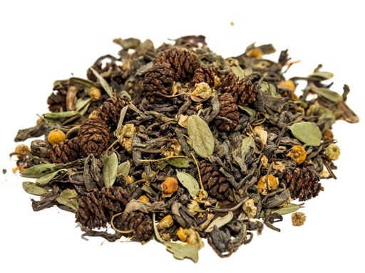 Бленд крупнолистового зеленого китайского чая, цветов ромашки, мяты, кусочков имбиря, листочков брусники и шишек ольхи.