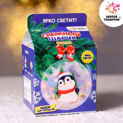 С набором для творчества от «Школы талантов» вы легко создадите новогодний снежный шарик — просто следуйте инструкции.Как сделать снежный шар?Приклейте фигурки к шарику: персонажа приклейте к донышку одной половинки, а ёлочку — к донышку другой.Когда клей высохнет, обмотайте гирлянду вокруг фигурок. Блок гирлянды также можно прикрепить ко дну одной из половинок, чтобы он был зафиксирован. Затем включите гирлянду.Насыпьте в одну из половинок шарика искусственный снег, затем соедините две половинки и немного потрясите шарик, чтобы снег внутри распределился.Проденьте ленточку через отверстие наверху получившейся игрушки, чтобы подвесить её на ёлку.Чудесный светящийся шарик готов!В наборе: ёлочный шар-основа, фигурки, гирлянда, декор.Рекомендовано для детей от 3 лет. Форма: Шар. Возраст: От 5 лет. Символ года: Нет. Тематика праздника: Новый год. Для создания: Набор для декорирования. Составляющие набора: Ёлочное украшение. Бесплатная доставка: Да. Наша разработка: Да.