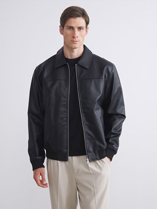 • Standart Kal?p G?mlek Yaka Erkek Deri G?r?n?ml? Ceket
