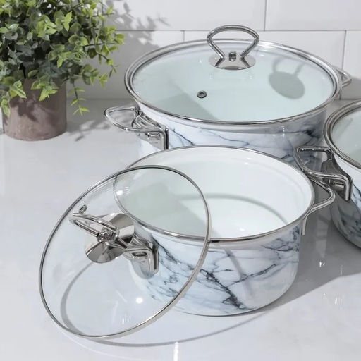 Кастрюли изготовлены из высококачественной стали с эмалированным покрытием, которое защищает металл от коррозии и придаёт посуде привлекательный внешний вид.