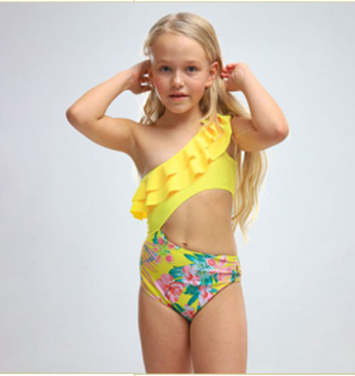 Слитный купальник на одно плечо. Спереди подкладка. Линия груди украшена оборками. В комплекте поролоновые вкладыши.