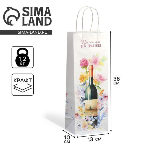 • Цена за 20 шт. Пакет подарочный под бутылку, упаковка, Прекрасного настроения, белый крафт, 13?36?10