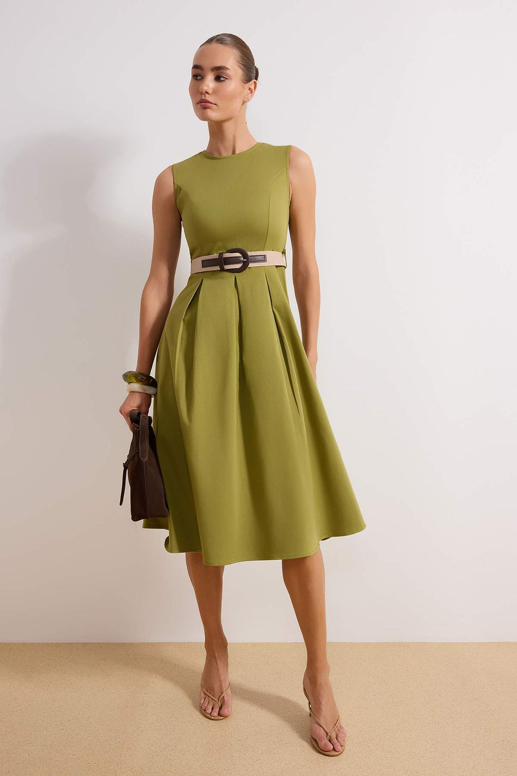 • Haki Duz Kemerli Pili Detayl? Midi Dokuma Elbise TWOSS26EL00123