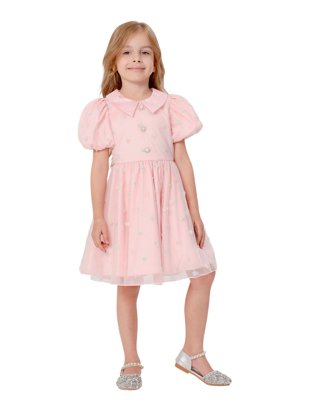 Нарядное платье из 3 слоев: фатин с объемной вышивкой, фатин с блестками и французский шелк; отрезное по линии талии; юбка со сборкой, рукава со сборкой на подкладке; воротник; на лифе 3 декоративные пуговицы со стразами; на спинке застёжка в виде длинной молнии; полупояса; на нижний слой юбки настрачивается ригилин. Подкладка 100% хлопок.