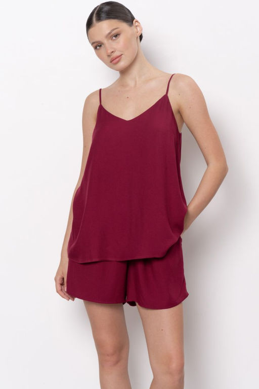 Вискоза 100% Пижама состоит из топа свободного прилегания на регулируемых бретелях и свободных шорт. Вырез горловины топа V- образный. Для большего комфорта и удобной посадки предусмотрены вытачки по линии груди. Шорты на мягком поясе с кулисой. В боковых швах функциональные карманы. Модель представлена в двух цветовых решениях.