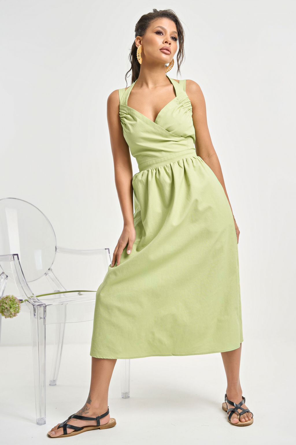 Особенности: Сарафан полуприлегающего силуэта на хлопковой подкладке. Лиф переда с элементом запаха, бретель через шею, на спинке выполнена шнуровка из широких полупоясов, в боковых швах карманы