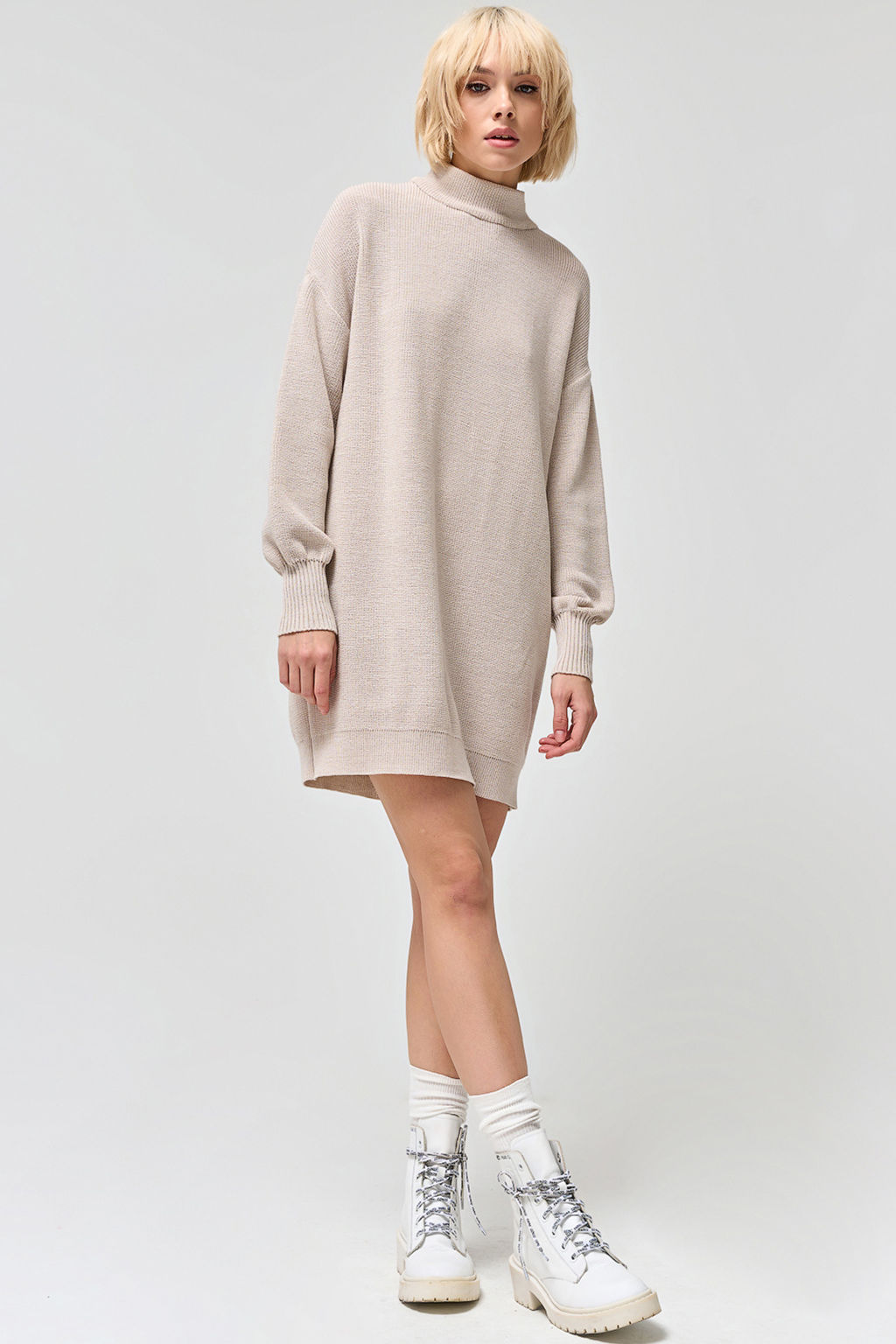 Особенности: Вязаное платье свободного силуэта выполнено из смесовой пряжи, фактурным способом.