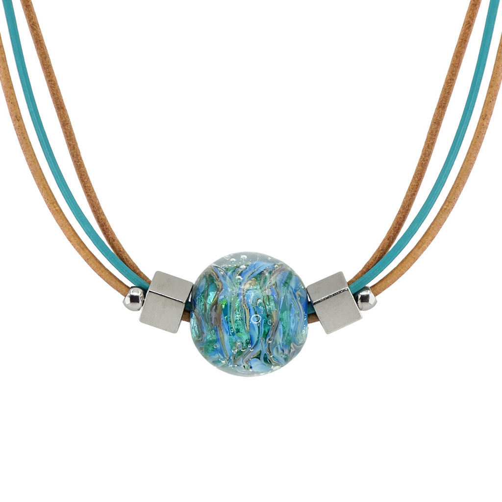 Колье изготовлено из натуральной кожи, муранского стекла и гипоаллергенной ювелирной стали, что очень важно для людей с чувствительной кожей. Металл не темнеет и не подвергается воздействиям окружающей среды, надолго обеспечивая красивый внешний вид изделия. Длина колье - 46 см + 5 см. удлиняющая цепочка. Диаметр стеклянного шара - 2,5 см. Вес - 30 гр.­