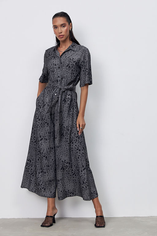 Стильный комбинезон из комфортной вискозной ткани. Свободный силуэт с застёжкой на пуговицы, в боковых швах карманы. Втачной короткий рукав. Вырез горловины обработан отложным воротником на стойке. Изделие с заниженной линией сидения обеспечивает комфортное движение. В комплекте пояс из основной ткани.