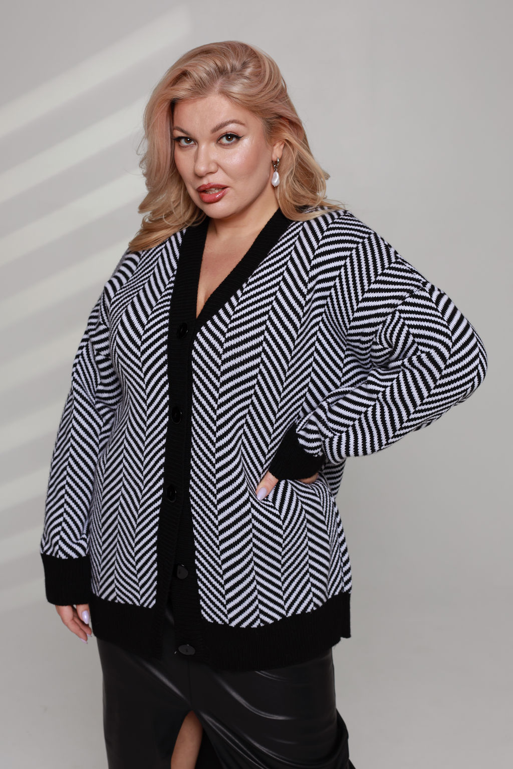 Кардиган из вязанного трикотажа  идеальное решение для стильных и модных женщин, которые стремятся выглядеть привлекательно и комфортно в любое время года. Глубокий V-образный вырез переходит в планку с пуговками. Кардиган можно носить как открытым, так и застегнутым на пуговицы это позволяет создавать различные стильные сочетания. Манжеты на рукавах полной длины и  низ изделия связаны в технике английской резинки. Актуальный принт добавляет динамичности и оригинальности. Благодаря своему универсальному дизайну, этот кардиган идеально сочетается с любыми нарядами - от повседневных до вечерних.  Безупречный стиль этого изделия подчеркнет вашу индивидуальность и придаст образу шарма и элегантности.­