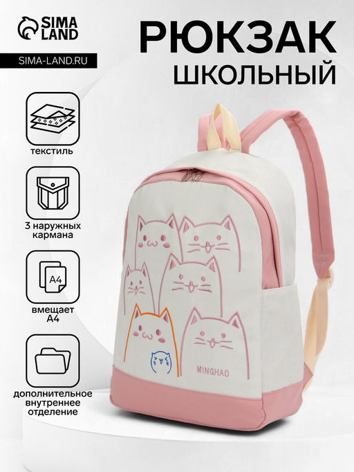 Рюкзак школьный на молнии, с карманами, с рисунком, размер 30?14?43 см, белый/розовый