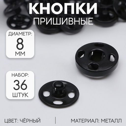 • Цена за 3 шт. Кнопки пришивные, d=8 мм, 36 шт., чёрные