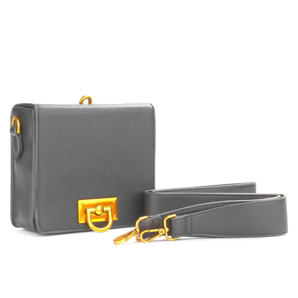Стильная женская сумка с петлей на запястье выполнена из экокожи серого цвета и имеет фурнитуру, стилизованную под винтажное золото. Одно общее отделение закрывается на поворотный замок, выполняющий также декоративную функцию. В комплекте с сумкой поставляются: 1 ремень-петля на запястье, 1 наплечный ремень. Размер: 16*18*7 см.