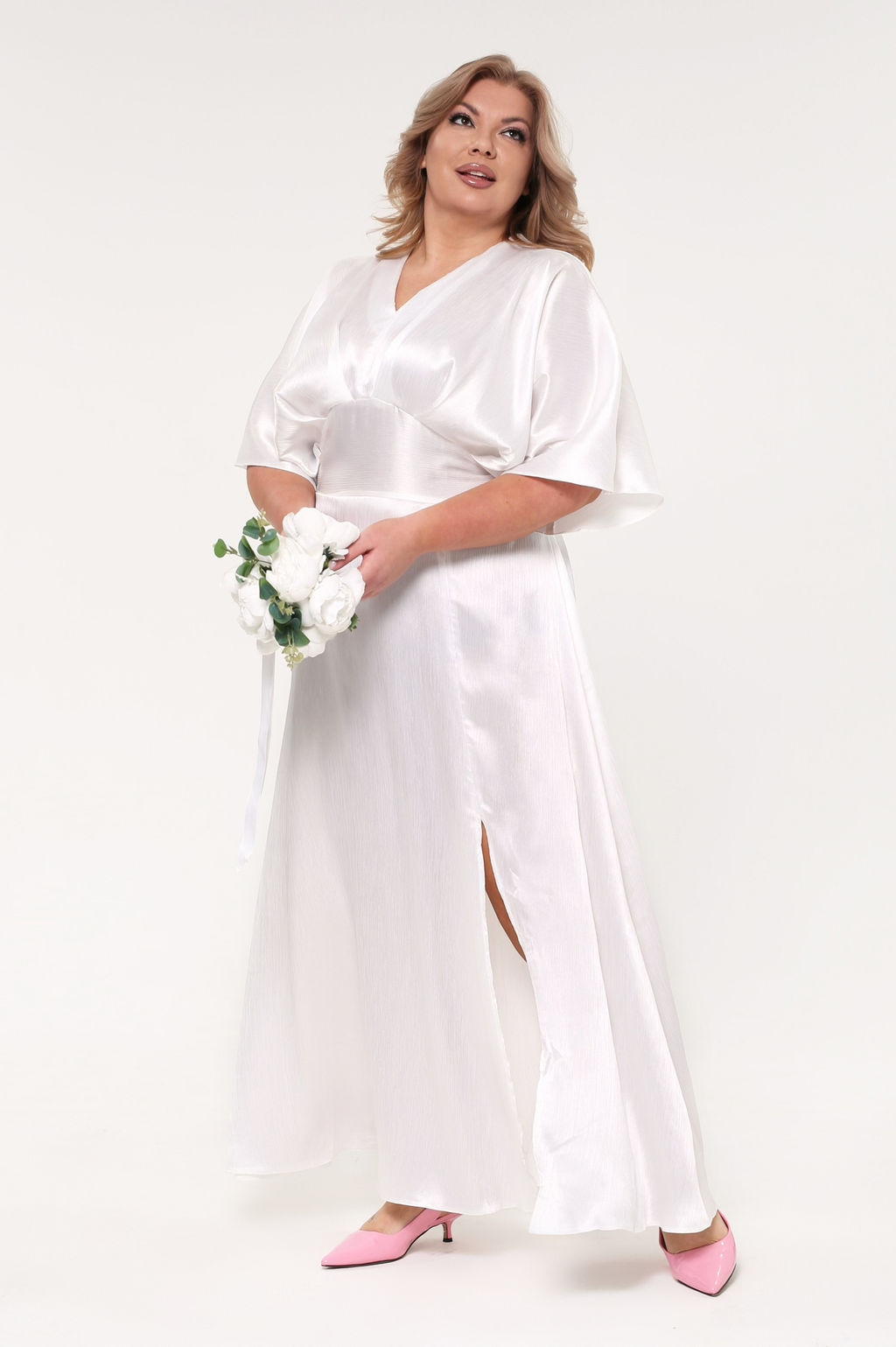 Платье шелковое V-вырез со сборкой под грудью с разрезом белое свадебное