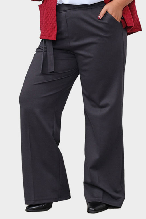 Брюки прямого кроя из мягкого материала имеют высокую линию талии. Благодаря удобной резинке на поясе, они отлично сидят на фигуре. Широкие брюки-клеш придают модели оригинальность. По бокам расположены практичные карманы. Съемный пояс в тон позволяет подчеркнуть талию. Для поддержания пояса предусмотрены шлевки. Эти брюки подходят женщинам с разными типами фигуры. Легкие и гламурные палаццо выгодно подчеркивают фигуру и выделяют из толпы. Для завершения стильного образа можно надеть туфли на высоких каблуках.­