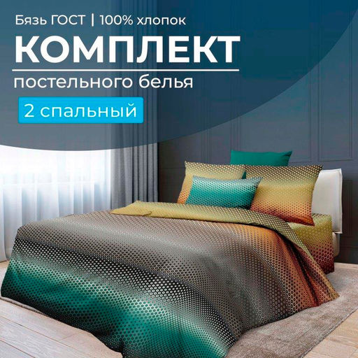 Двухспальное постельное белье безупречного качества из очень плотной ткани - бязи ГОСТ плотность 140 г/м2. Это очень плотная, имеющая длительный срок службы ткань, рисунки на которой смотрятся четко и красиво. Ну и, конечно, у этой ткани абсолютно натуральный состав, хлопок 100 %, она очень комфортна, экологична, гипоаллергенная, что способствует вашему полноценному отдыху! В комплекте: пододеяльник размером 180 * 215 см (прорезь в нижнем шве, длиной 70 см), простыня размером 180 * 220 см, две наволочки размером 70 * 70 см с глубоким клапаном не менее 25 см. Мы используем только натуральные материалы и передовые технологии, а наши опытные специалисты обеспечивают качественный пошив. Наши изделия произведены в Ивановской области, имеют сертификацию качества "ГОСТ 31307-2005", а также зарегистрированы в государственной системе маркировки "Честный знак". Обращаем внимание на то, что наволочки кроятся из разных мест принта, поэтому расположение рисунка может отличаться от представленного на фото. -- Характеристики -- Вес: 1950 кг Размерность комплекта: 2-х спальный Комплектность: 1 пододеяльник, 1 простыня, 2 наволочки Количество предметов в комплекте: 4 Размерность пододеяльника: 2-х спальный Размер пододеяльника: 180x215 Кол-во пододеяльников в комплекте: 1 Замок пододеяльника: С прорезью Длина прорези (см): 70 см Размерность простыни: 2-спальная Размер простыни: 180x220 Размер наволочки: 70x70 Замок наволочки: С клапаном Кол-во наволочек в комплекте: 2 Ткань: Бязь ГОСТ Состав: 100 % хлопок Плотность: 140 г/м2 Плотность плетения: Высокая Отделка: Без отделки Режим стирки: При 40 градусах Цвет: Зеленый Расцветка: Артплей Вид принта: Абстракция Целевая аудитория: Взрослая
