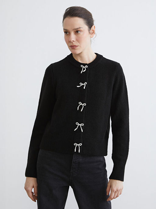 • Bisiklet Yaka Fiyonk D??meli Kad?n Triko H?rka