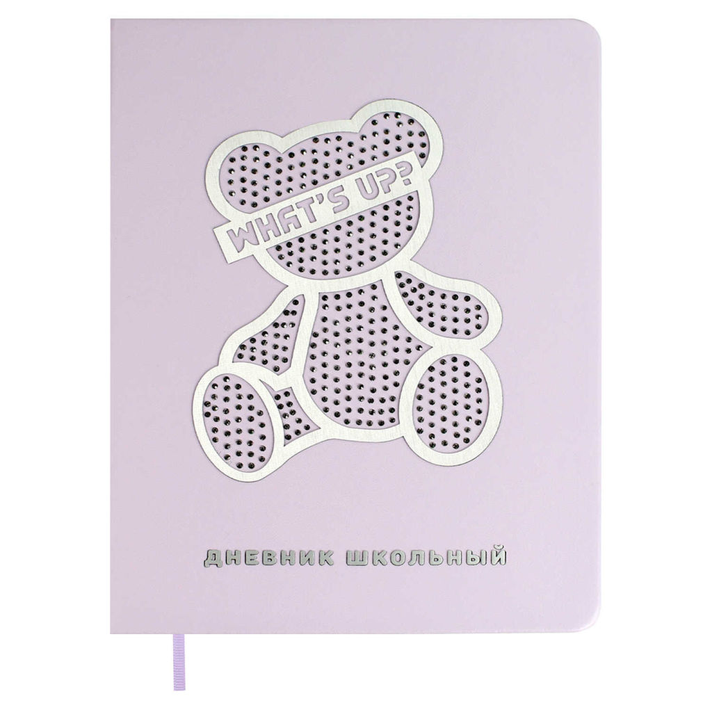Дневник школьный арт. 68769 / 15 СЕРЕБРЯНЫЙ МИШКА (кожзам: А5+; твёрдый переплёт, материал обложки: искусственная кожа "Плонже"; декор: аппликация из резины, аппликация из страз; способ крепления блока: ниткошвейный; вн. блок: 48 л., белый офсет 80 г/м?, печать в одну краску, справочный материал: универсальная шпаргалка; отделка среза: фольгирование; закладка: одно ляссе; форзац: печать пантоном; индивидуальная упаковка: ПЭТ-пакет)