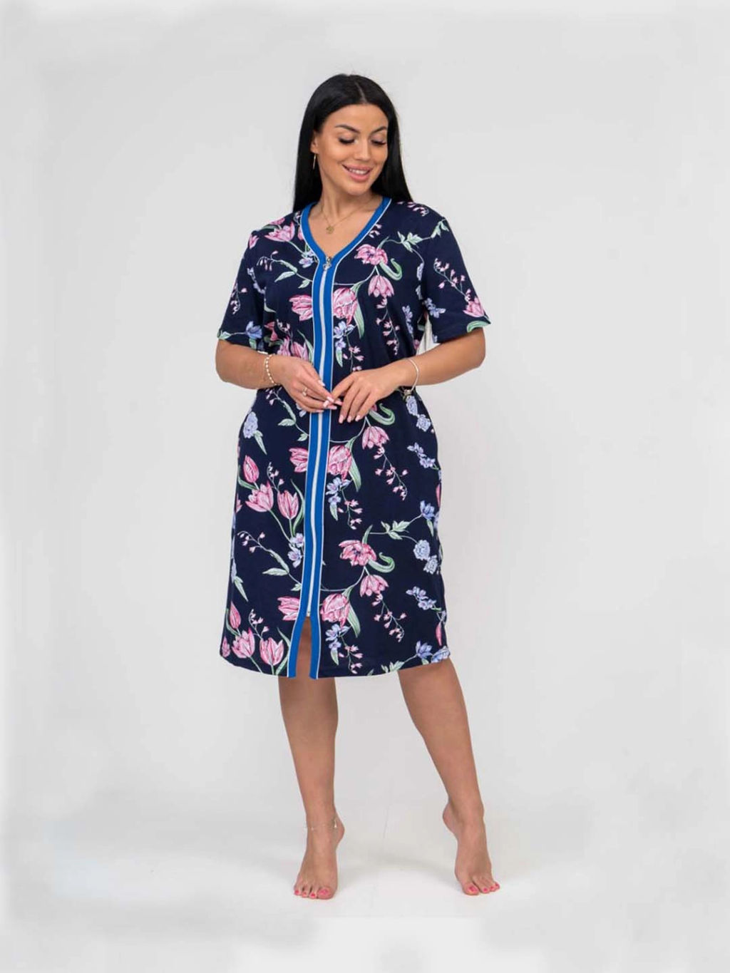 Халат женский на молнии, полуприлегающего силуэта, с V-образной горловиной, рукав короткий прямой, на полочке карманы в боковых швах, спинка с резинкой по талии, длиной до колен.­
