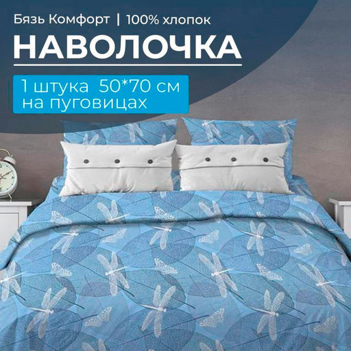 Артикул: Наволочка 50*70 см, бязь "Комфорт", на пуговицах (Стрекозы, голубой)
