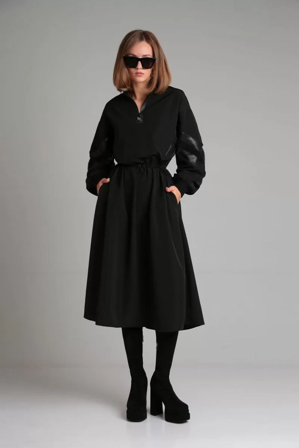 Платье свободного силуэта с кулисой по талии. Резиновая TUCH молния по переду. Рукава широкие со вставками из экокожи. По низу рукава и воротнику довяз. В боковых швах карманы. Длина платья 122-124 см Длина рукава от основания шеи 74-76 см