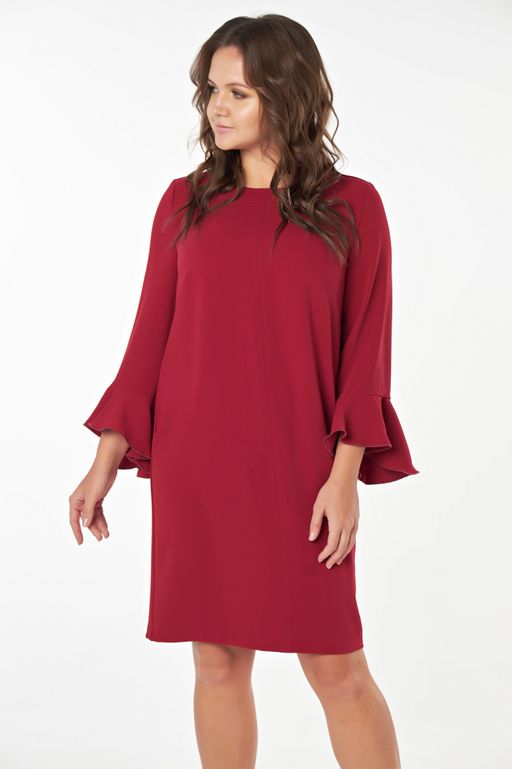 Особенности: Платье из плотной плательной ткани с декоративными воланами по рукавам. Детали: горловина округлой формы с отстрочкой, вертикальное членение по переду, вытачки, застежка по спинке на потайную молнию. Рукав 3/4 с притачным асимметричным воланом по низу.