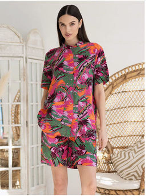 Комплект Mia-Amore состоит из рубашки с воротником-стойкой и удлиненных шорт, выполнен из вискозы с ярким принтом. Шорты с широким эластичным поясом. По бокам шорт расположены карманы.