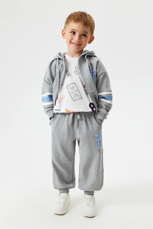 Серые детские брюки-джоггеры для мальчика выполнены из хлопкового футера с петлями на изнанке (без начеса). Просторная модель обеспечивает легкость движений, благодаря чему она подходит не только для создания спортивных образов, но и для уроков физкультуры и активных игр. Эластичный пояс на резинке обеспечивает комфортную посадку на разные типы фигур и дополнительно фиксируется шнурком. По низу штанин расположены манжеты из рибового полотна, обеспечивающие качественное прилегание и сохранение формы изделия. В боковых швах расположены карманы. У левого кармана расположен принт с годом основания бренда.­