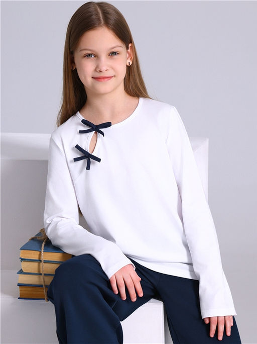 блузка,хлопок 92% + лайкра 8%,кулир с лайкрой / хлопок 92% + лайкра 8%,белый+темно-синий77 / - / Бантик аппликация / - / - / -,Блузка-лонгслив для девочки выполнена из легкого хлопкового полотна с лайкрой. Изделие с длинными рукавами, фигурным вырезом на полочке и декоративными бантами. Уход: только машинная стирка (руками не стирать!) при температуре 40 градусов, без предварительного замачивания.