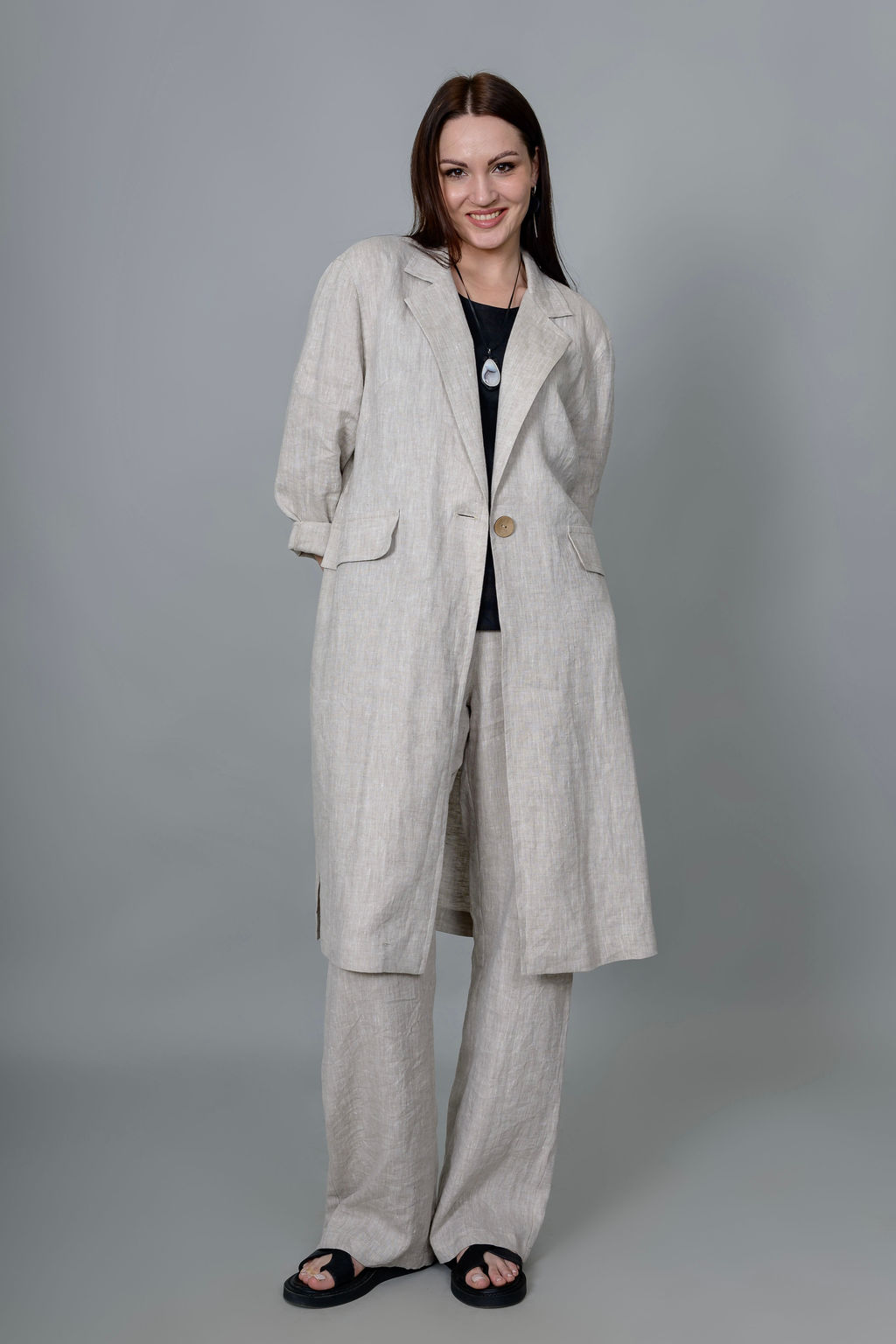 Стильный удлиненный жакет из натурального льна для создания безупречного образа. Прямой свободный крой элегантно драпирует фигуру, деликатно скрывая нюансы в области бедер и талии, и обеспечивает безупречный вид с брюками различных силуэтных форм. Рукав реглан создает естественную линию плеча. По боковым швам выполнены удобные карманы, декорированные накладными клапанами и высокие шлицы, что добавляет функциональности и элегантности этой модели. Длина чуть ниже колена создает выигрышную вертикаль, которая визуально вытягивает силуэт, делая его стройнее и изящнее. Модель без подкладки выполнена из плотного 100% льна, уникальные свойства которого обеспечивают комфорт в любую погоду.