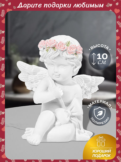 Декоративная статуэтка Ангелочек с бантом от Elan Gallery преобразит любое помещение. Размер изделия 9х7х10,5 см. Выполнена из полирезина современного материала, который славится своей лёгкостью, устойчивостью к влаге и солнечным лучам. Он не выделяет вредных веществ и не имеет запаха. Полирезин легко поддаётся обработке, поэтому изделия из него отличаются своей реалистичностью и проработанной детализацией. Голова ангела украшена венком из бутончиков роз, а через грудь повязана лента с бантиком. Венок покрыт золотистыми блёстками, ярко играющими на свету. Настольная фигурка дополнит и освежит антураж любой комнаты. Разместите маленькую статуэтку на полке, тумбочке или рабочем столе, задействуйте в композиции с декоративными веточками и растениями или другими фигурками. Она станет нежным и трогательным дополнением вашей квартиры. Не рекомендуется применять абразивные моющие средства. В коллекции бренда Элан Галерея вы найдёте множество как ярких, так и нежных декоративных украшений каждый обязательно подберёт сувенир на свой вкус. Они станут чудесным подарком для родных, близких и коллег. Наполните пространство вокруг себя радостью!
