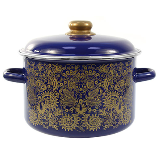 • "Узор" Кастрюля эмалированная 5,5л, д24см, h15см, цилиндрическая форма, металлическая крышка с пластмассовой ручкой-кнопкой, ободок из нержавеющей стали, синий (Россия)