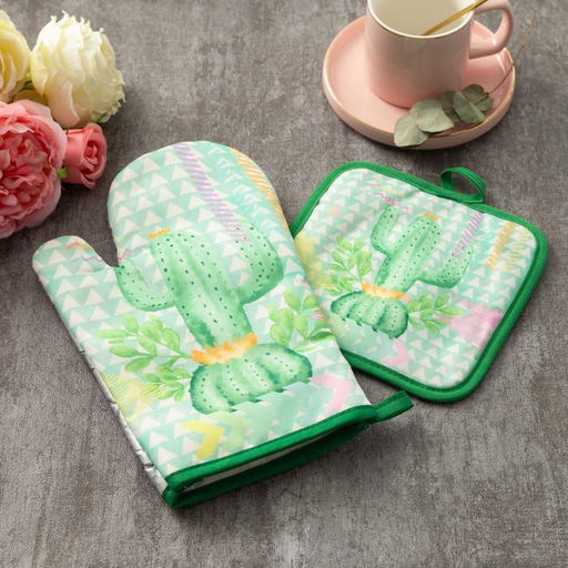 Кухонный набор Доляна «Кактус»: прихватка 17×17 см, варежка 26×16 см, цвет зелёный, 100% п/э